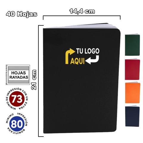 Anotador ecológico con tapa blanda. Anotador de color de 40 hojas / 80 páginas rayadas. Terminación de puntas redondeadas y costura visible del color de la tapa en el acabado. Tamaño A5 . Impresión